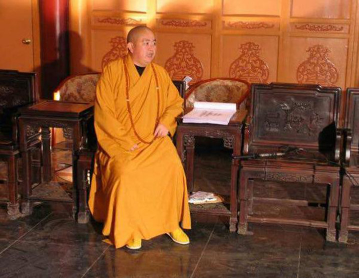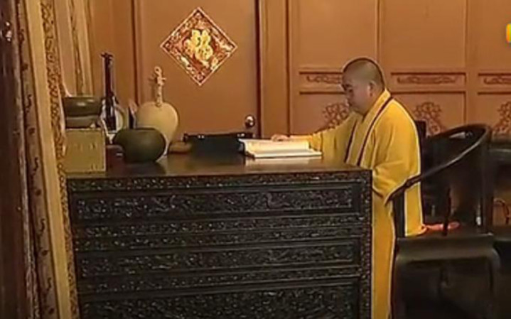 释永信在少林寺把自己的方丈办公室可谓装修得相当气派,尤其是软装方面。一整套的红木家具,每把椅子都刻有花纹,而且看起来十分厚实,粗略估算没有7位数拿不下来。